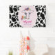 Cuesta, graciosa, vaca sagrada rosa con pancarta floral de fiesta de primer cumpleaños.