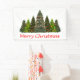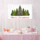 Siete árboles de Navidad decorados seguidos con Feliz Navidad escrito debajo de ellos.