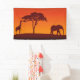 Fondo africano del paisaje del safari que ofrece siluetas de una jirafa, de un árbol y de un elefante contra la puesta del sol en sombras del color anaranjado y rojo.