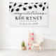 Banner moderno del partido de graduación con un sencillo fondo blanco que se puede cambiar a cualquier color, gorras de mortero negras cayendo y una plantilla de texto de felicitaciones que es fácil de personalizar.