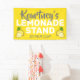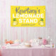 Banner de pie de limonada brillante con fondo amarillo lindo, limones dibujados por vectores y una plantilla de texto editable para su personalizar.