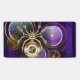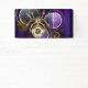 Araña de acero de oro y acero con relojes antiguos decorados con artes dorados sobre el fondo morado, rayado, texturado con lentes y engranajes de latón. Estilo Steampunk.