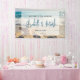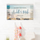 Cartel de un boda con una foto panorámica de destino tropical. Una gran estrella de mar colocada en una playa de arena fina. Un hermoso mar azul con olas de olas de surf blancas en el fondo.