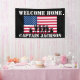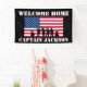 Una simple pancarta militar de 'BIENVENIDA A CASA', que incluye, la bandera estadounidense, la palabra "felicitaciones", soldados en silueta y el nombre del soldado. Todo el estilo de texto, tamaño y color se puede cambiar haciendo clic en el enlace posterior del personalizar después de la personalización.
