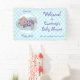 Este banner es una buena forma de saludar a los clientes que llegan a su ducha de bebé. Cuenta con un adorable oso de peluche marrón dormido que lleva puesto un dormilón morado con estrellas doradas. El oso bebé está durmiendo sobre una manta azul opaca. La imagen está enmarcada en un delgado círculo de líneas azules, y se sitúa en un fondo de gingham azul. Hay un campo de texto personalizado en azul más oscuro en la parte superior e inferior, y su información está en la parte derecha en color morado y azul.