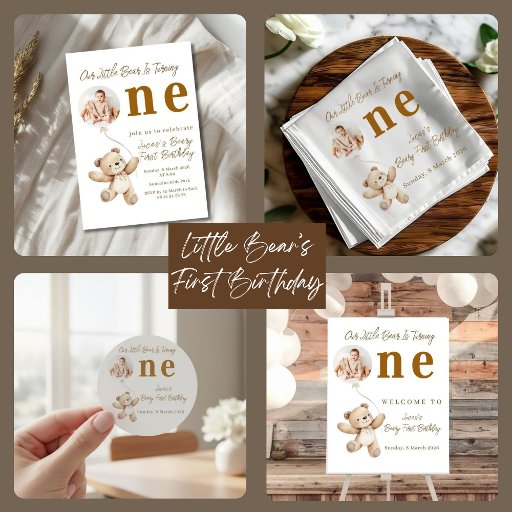 This charming teddy bear birthday banner features a soft neutral bear illustration, elegant typography, and a custom photo area to showcase your baby’s sweet smile.