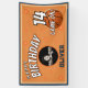 Estandarte de telón de fondo para foto de cumpleaños de deportes de baloncesto. Un estandarte moderno de celebración de cumpleaños personalizado con un balón de baloncesto, nombre, edad y foto. El fondo es naranja con estrellas. Puedes cambiar cualquier texto en el estandarte.