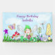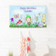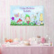 Pancarta personalizada Happy Birthday Fairy Tale con hadas extravagantes, setas, mariposas, libélulas, flores, oruga, ranas y un caracol mágico.