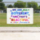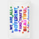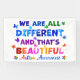 Cita inspiradora de "Todos somos DIFERENTES y eso es BELLO" con singulares rompecabezas de autismo, y coloridas mariposas volando en el fondo para apoyar y defender la conciencia del autismo.