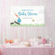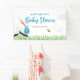 Pancarta de un fiesta de personalizable deliciosamente encantadora para un niño que ducha con un bebé, que incluye una cigüeña adorable con abejas y mariposa en la pradera. Un suave fondo pastel, y en su centro una cigüeña caprichosa, ilustrada con gracia, lleva un dulce paquete envuelto en un paño suave. Alrededor de la cigüeña, unas cuantas abejas juguetonas con sonrisas amistosas y una mariposa alrededor, le dan un toque animado a la escena. Nubes suaves y onduladas adornan el cielo. Celebre la llegada inminente del recién nacido con esta linda ducha de bebé con temática de cigüeñas. Este ilustracion transmite un sentido de alegría, calidez y expectación festiva del miembro más nuevo de la familia. Personaliza el elemento con tu información.