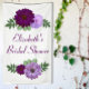 Diseño elegante de despedida de soltera con flores en tonos púrpura con eucalipto y vegetación botánica