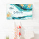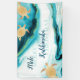 Tortugas tribales de oro sobre un fondo verde azulado de tinta blanca de mármol aguamarina. Con un texto de Mele Kalikimaka y un texto de Feliz Navidad en el fondo. Las tortugas son un tótem de protección y en mi tienda, les ofrezco una colección de productos impresos con los diseños estéticos de Navidades hawaianos de la Tortuga.