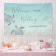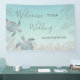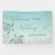 Banner de recepción de bienvenida boda con dos elegantes tortugas plateadas y hojas tropicales sobre un fondo abstracto de estilo playero. Personalizar con los nombres de su novia y de su novio y la fecha de su boda. Para tu boda hawaii, boda de verano, boda en la playa.