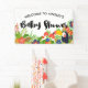 bandera Tropical-temática de la fiesta de bienvenida al bebé en colores brillantes: rojo, azul, y verde. La fiesta de bienvenida al bebé se escribe en una escritura intrépida de la caligrafía. En la parte inferior, una miríada de flores tropicales coloridas, plantas, y bayas, y una sonrisa toucan.