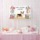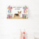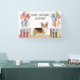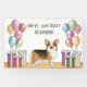 El original ilustracion personalizado de Destei de un abrigo tricolor de cabeza roja Pembroke Perro de raza Corgi galés. El perro está situado en un entorno de colorido cumpleaños con globos y regalos de cumpleaños de color pastel. Los colores pastel son rosa, verde, azul, rojo, naranja y violeta. El perro está parado en una textura de parqué amarillo y el fondo tiene un juego de puntos polka de color pastel. También hay un área de texto personalizable.