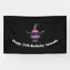 Cartel de cumpleaños con un divertido ilustracion temático de Halloween para los amantes del gato. Un gato negro de ojos grandes vestido con el gorra de una gran bruja negra con un cinturón rosado violáceo alrededor del borde.
