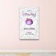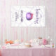 Carterel de bienvenida para baby shower de niña adorable con una ilustración de un caldero de bruja burbujeante en colores rosa y morado. Ilustrado y diseñado por Patricia Alvarez.