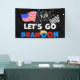 El popular eslogan político, "Vamos Brandon" y FJB con la bandera estadounidense y la bandera de las carreras de autos, y un único ilustracion del pelo de Donald Trump.