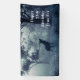 Cartel con la foto de un venado de la región con cuerdas paradas en un bosque oscuro entre árboles iluminados por el sol. Nieve por todas partes.