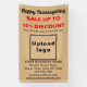¡Feliz Día de Acción de Gracias! Festividad para celebrar este noviembre para agradecer por las bendiciones que recibimos. También es una de las vacaciones para promocionar su negocio. Banner de personalizable con la venta de Acción de Gracias, su nombre comercial y otra información. Cartel que se puede usar como material de marketing para atraer más clientes. Personalizar y muéstralo para convencer a más clientes de que compren sus productos o clientes para que les gusten sus servicios. Los colores de diseño son textos negros, marrones oscuros y rojos sobre fondo marrón claro. Los contenidos son Feliz Día de Acción de Gracias, venta de textos con un porcentaje de descuento que ofrecerás, fechas de venta, tu nombre de negocio, logotipo, dirección, número de teléfono, correo electrónico y sitio web o tu página de medios sociales de negocios. Compruebe la apariencia después de cargar el logotipo y escribir textos. Si la apariencia le resulta agradable, puede realizar su pedido ahora. Si necesita cambiar el tamaño y mover el logotipo y los textos para que encajen en este cartel o en el tamaño que elija, por favor cambie la herramienta de diseño. También puede cambiar el color de fondo, el color de fuente y el estilo de fuente en la herramienta de diseño. ¡Feliz Día de Acción de Gracias! Te deseo más ventas esta fiesta.