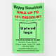 ¡Feliz Janucá! Deseándole alegría, paz y bendición en este festival de las luces. Fiesta para celebrar en diciembre y también para promocionar su negocio. Estandarte personalizable con Venta de Janucá, nombre de su empresa y otra información. Estandarte que puede utilizar como material de marketing para atraer a más clientes. Personalícelo y muéstrelo para convencer a más clientes de que compren sus productos o a que les gusten sus servicios. Los colores del diseño son verde oscuro y textos rojos sobre fondo verde claro. Los contenidos son saludo de Feliz Janucá, textos de venta con porcentaje de descuento que ofrecerá, fechas de la venta, nombre de la empresa, logotipo, dirección, número de teléfono, correo electrónico y sitio web o página de redes sociales de la empresa. Por favor, compruebe la apariencia después de subir el logotipo y escribir los textos. Si la apariencia es de su agrado, puede realizar su pedido ahora. Si necesita cambiar el tamaño y mover el logotipo y los textos para que se ajusten a este estandarte o al tamaño que elija, por favor, hágalo en la herramienta de diseño. También puede cambiar el color de fondo, el color de la fuente y el estilo