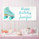 Añade un toque personalizado a los fiestas con temas de patinaje sobre ruedas o simplemente di un feliz cumpleaños a alguien que le gusta patinar. Este banner personalizado presenta un ilustracion de una patineta de rodillos de estilo retro con luz verde azulada con tu mensaje a su lado en la coordinación de la escritura de letras.