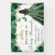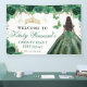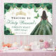 Magnífica acuarela piel oscura princesa de cabello negro en diseño de vestido verde esmeralda con flores, tiara, verde y purpurina dorado