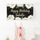 Cartel personalizado "Feliz cumpleaños" para chicas decorados con hermosas y elegantes rosas blancas/flores con un purpurina de oro brillante sobre un fondo negro. Personalizado con el nombre del invitado de honor.