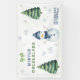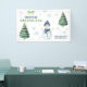 Cumpleaños de los niños con acuarelas. Nevador acuático, copos de nieve, pinos verdes, arco verde.