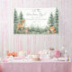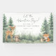 “Let the Adventure Begin!” Woodland-Themed Baby Shower Horizontal Banner. Celebrate your baby shower with this sweet woodland-themed horizontal banner, featuring a charming watercolor scene with forest friends—a deer, fox, raccoon, mouse, and hedgehog—gathered in a peaceful meadow with tall pine trees.
