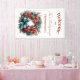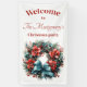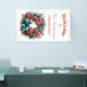 Cartel con un Navidad de bonitos. Una imagen festiva con una guirnalda de pino decorada con flores rojas, florida y una bonita proa azul. Encantador.