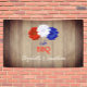 Hago barbacoa con flores patrióticas rojas, blancas y azules contra un fondo rústico de madera