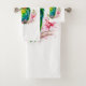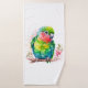 Toalla con un bonito ilustracion de loro. Un pequeño loro verde con colores azules y amarillos que se mezclan. El cuello tiene una vibrante sombra de rosa rojizo.