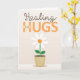 Envíe a alguien deseos de curación felices después de su cirugía con esta tarjeta única y divertida de estilo ilustrativo, que incluye el mensaje, "Curando HUGS mientras se recupera de la cirugía" con flor en la olla en el fondo. La "H" en "HUGS" incluye un sonriente acento de ilustracion de vendas. Adentro tiene este verso de los proverbios dentro de la izquierda, "Un corazón alegre hace bien como la medicina, y dentro de la derecha tiene este mensaje de marcador de posición, pero puede ser totalmente personalizado para que se ajuste a sus necesidades: "Enviando HUGS curativos y SONRISA a tu manera, y esperando que te sientas más como tu yo normal todos los días. ¡BIEN PRONTO!"