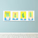 Este lienzo blanco presenta cuatro modernos dibujos de medios mixtos de diferentes cactus, todos en ollas. Hay una pera espinosa, euforbia, cactus de bola roja y un solo cactus de lóbulo. Están en ollas a juego, sobre una base azul contra un fondo amarillo. Cada dibujo tiene un borde negro estrecho, con un contorno blanco. El fondo es blanco. Las obras de arte son lindas, simples e ingenuas y se verían estupendas en una casa moderna. Es original y sólo está disponible en The Art of Being Beth.