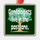 Este ornamento divertido de la genealogía ofrece un árbol en un fondo verde oscuro y el subtítulo "Genealogists vive en el último carril." El diseño está solamente sobre el lado frontal del ornamento. También disponible en otras formas y como ornamentos de cerámica con la impresión en ambos lados. Este ornamento miraría el gran colgante de su árbol de navidad, de su espejo de la vista posterior, o como tirón de la fan de techo. Hace una gran embutidora del regalo o de la media para un genealogist que busca para los antepasados en su árbol de familia.