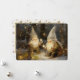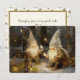 Esta encantadora tarjeta de vacaciones captura un momento tranquilo de magia invernal, con dos gnomos barbudos vestidos con sombreros altos y puntiagudos blancos, ubicados en un bosque nevado y crepuscular. Representados en un estilo clásico y pictórico, el par caprichoso se muestra iluminando la oscuridad sosteniendo y colgando bombillas cálidas de estilo vintage que proyectan un resplandor dorado y acogedor contra los troncos de árboles de color gris azulado y fresco. El contraste entre los bosques helados y silenciosos y la radiante invitación de las luces crea una atmósfera reconfortante de paz y preparación festiva, perfecta para compartir un mensaje de esperanza y asombro en esta temporada.