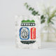 Un escarabajo dibujado ocupa un lugar central en un rectángulo de borde áspero y azul, flanqueado a la derecha por una franja roja, vertical y adornada con flores rojas y naranjas. Por encima y por debajo están las tapas finales con puntos verdes y negros y blancos.