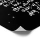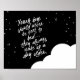 Una hermosa impresión para la pared del cuarto del bebé que cita la historia de Peter Pan, "Los jóvenes nunca deben ser enviados a la cama... siempre se despiertan un día mayores", en un texto cursivo en negrita con un aspecto de letra a mano. Tipografía contemporánea impresa caprichosamente en blanco sobre un fondo negro de moda decorado con una nube blanca esponjosa y una lluvia de pequeñas estrellas. Un hermoso añadido a la pared de la galería del dormitorio de un niño.