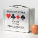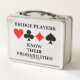 Cualquier jugador de puentes ávido disfrutará de esta metalizado lonchera con los cuatro palos de cartas junto con el siguiente puente diciendo: "Los Jugadores Puentes Conocen Sus Probabilidades". ¡Memorable puente de truismo que dice metalizado caja de almuerzo para cualquier maestro puente o director de puente!
