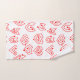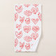 Este conjunto de toallas tiene un diseño moderno de mediados de siglo de San Valentín de máscaras rojas dispersas en un campo blanco.