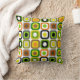 Cuadrados abstractos enrrollados y círculos de la almohada moderna de los mediados de siglo en un diseño brillantemente colorido en sombras del gris verde, del marrón negro y del oro. Detrás de la almohada en diseño de coordinación. Perfeccione para cualquier hogar y forma de vida modernos de los mediados de siglo.