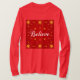 Esta es una camiseta de las Navidades de la manga roja de creencia de las mujeres. La camiseta de los Navidades tiene la palabra Creer en texto blanco centrado en el frente. El diseño de Believe fue creado con arte generativo. El arte presenta un fondo rojo Navidad con la palabra Creer en texto blanco en el centro. Hay estrellas de oro alrededor del Believe. El diseño de los Navidades está en la parte delantera y trasera de la camiseta.