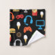 Los niños personalizaron el sistema de la toalla del modelo del videojugador de los bocados del videojuego. El monograma y personaliza con nombre en la toalla de baño grande. Modelo de los reguladores del videojuego, alimentos de preparación rápida, anillos de espuma del helado, en fondo negro. Modelo del videojugador. www.SamAnnDesigns.com