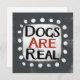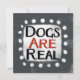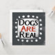 "Los perros son reales" es un lindo diseño de texto en gris con texto en negro y rojo, junto con una forma de acento blanco y puntos caprichosos de textura blanca que lo rodean.