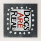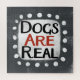 "Los perros son reales" es un lindo diseño de texto en gris con texto en negro y rojo, junto con una forma de acento blanco y puntos caprichosos de textura blanca que lo rodean.