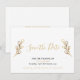 Invite a todos sus huéspedes con estilo con esta magnífica tarjeta "Save the date", que incluye ramas de bonito de efecto dorado y texto elegante. La tarjeta contiene un guión elegante y grande que dice "Guardar la fecha". Puede cambiar los nombres y cualquier otra información, como la ubicación y las fechas, y agregar sus propios detalles del boda o mensaje personal en la parte posterior de la tarjeta. Tenga en cuenta que el efecto dorado está impreso.