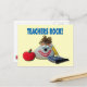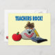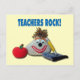 Postal corta con diseño fotográfico de una roca sonriente decorada acompañada de un bloc de notas de fieltro, lápiz y manzana, que dice "¡Rock de los profesores!"