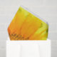 Papel de papel de regalo con la imagen de un girasol amarillo contra un fondo de polka blanco y negro.