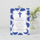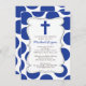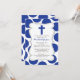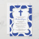 Invitación a un sagrado bautismo lindo con una cruz azul puesta en un marco de moda elegante sobre un popular fondo de polka azul. Invierta nuestra moderna invitación al bautismo para encontrar una polka azul marino y blanco a juego. Perfecto para un bautismo o bautismo contemporáneo para niños. Disponible en nuestra tienda en una variedad de colores para un niño o niña.